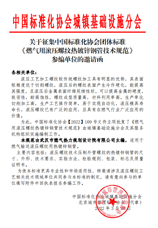 為此,中國(guó)標(biāo)準(zhǔn)化協(xié)會(huì)【2022】109號(hào)文件立項(xiàng)批復(fù)了《燃?xì)庥脻L壓螺紋熱鍍鋅鋼管技術(shù)規(guī)范》由城鎮(zhèn)基礎(chǔ)設(shè)施分會(huì)及其服務(wù)機(jī)構(gòu)組織實(shí)施編制工作。