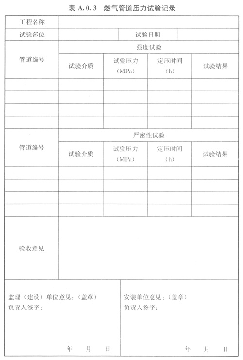 A03燃?xì)夤艿缐毫υ囼?yàn)記錄可按表A03的格式記錄。