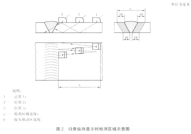 檢測區(qū)域(見圖2)是指焊縫和焊縫兩側(cè)至少10mm寬母材或熱影響區(qū)寬度(取二者較大值)的內(nèi)部區(qū)域。