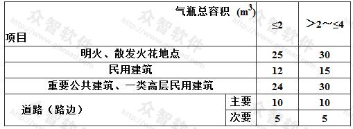 LNG氣瓶組與建、構(gòu)筑物的防火間距是參考本規(guī)范中液化石油氣瓶組間至建、構(gòu)筑物的防火間距編制的,但考慮到液化石油氣的最大氣瓶為50kg(容積118L),而LNG氣瓶最大為410L,因而對(duì)氣瓶組至民用建筑或重要公共建筑的防火間距規(guī)定,LNG氣瓶組比液化石油氣氣瓶間要大一些。