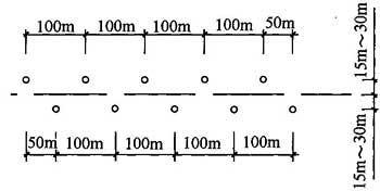 1 勘探孔應(yīng)沿穿越管線的軸線兩側(cè)錯(cuò)開(kāi)布置,孔距不宜大于100m,每排孔與穿越管線軸線的距離應(yīng)為15m~30m(圖4.3.5),