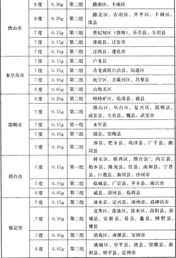 本附錄僅提供我國各縣級及縣級以上城鎮(zhèn)地區(qū)建筑工程抗震設計時所采用的抗震設防烈度(以下簡稱“烈度”)、設計基本地震加速度值(以下簡稱“加速度”)和所屬的設計地震分組(以下簡稱(“分組”)。本表摘自《建筑抗震設計規(guī)范》 GB50011-2010(2016年版)附錄A
