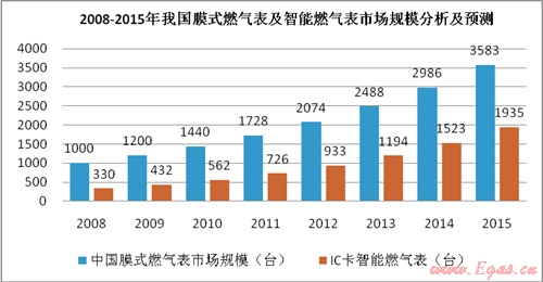 根據(jù)中國計(jì)量協(xié)會(huì)的相關(guān)數(shù)據(jù),我國目前約有100家燃?xì)獗韽S,2008年總產(chǎn)量為1000萬臺,每年的復(fù)合增長率約為20%。具有中國特色的智能膜式燃?xì)獗?,以IC卡預(yù)付費(fèi)為主導(dǎo)產(chǎn)品,總量逐年上升,已占膜式燃?xì)獗砜偭康?0%以上。預(yù)計(jì)2015年我國燃?xì)獗砜偖a(chǎn)量為3583萬臺,智能燃?xì)獗砜偖a(chǎn)量為1935萬臺。