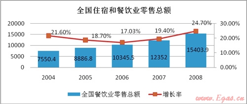 從國家統(tǒng)計(jì)局網(wǎng)站上了解到2008年我國從事住宿和餐飲的企業(yè)法人有37151個(gè),全國餐飲業(yè)營業(yè)額已達(dá)到4824億元,每年的復(fù)合增長率達(dá)到20%。