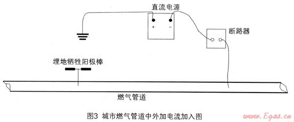 城市燃氣管道與長輸燃氣管道相比,布局復(fù)雜,支管多,管道周圍干擾因素多,燃氣泄漏造成的危害大,必須對城市燃氣管網(wǎng)進行定期的防腐層檢測,確保安全[4]。目前我國的城市燃氣管網(wǎng)陰極保護主要采取犧牲陽極方法,而DCVG檢測技術(shù)需要外加電源,所以應(yīng)用時須在燃氣管道中加直流電流。直流電源的外加如圖3所示:可調(diào)節(jié)的直流電源正極接地,負極通過閥門測試樁或閥門井與燃氣管道壁連接,負極與燃氣管道之間接電路通斷器來實現(xiàn)管路電流的周期性通斷。