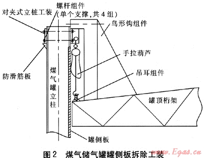 ② 煤氣儲氣罐側板拆除過程中,罐頂作為施工平臺在下降過程中,應統(tǒng)一指揮,同步操作,確保手拉葫蘆的同步性;鳥形鉤及立柱工裝的固定一定要作好安裝質量檢查,確保安全使用。