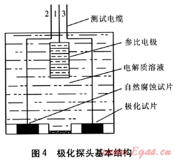 極化探頭由測(cè)試試片(自然腐蝕試片和極化試片)、參比電極和電解質(zhì)組成,其基本結(jié)構(gòu)見圖4。極化試片用和管道相同的材質(zhì)制成,并用導(dǎo)線與管道相連,外部用絕緣體隔離,只留一個(gè)多孔塞子(滲透膜)作為測(cè)量通路,這樣的結(jié)構(gòu)可使參比電極和燃?xì)夤艿乐g的電阻壓降最小,直接測(cè)量無IR降電位,而不必?cái)嚅_管道保護(hù)電流或間歇中斷與管道連接的電纜。只有將電位測(cè)試探頭處于與管道相同的土壤中,電位測(cè)試探頭才有效。