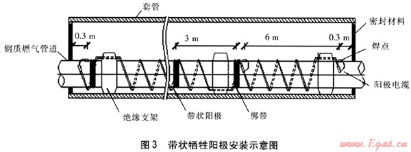 考慮到帶外防腐層的鋼質(zhì)套管的屏蔽作用,可以在套管內(nèi)設(shè)置局部陰極保護(hù)以解決套管屏蔽的問題[7]。套管內(nèi)的鋼質(zhì)燃?xì)夤艿揽刹捎脦顮奚枠O。帶狀犧牲陽極具有一定的柔性,可以緊緊纏繞在管道之外,位于套管之內(nèi),陽極電纜可以直接焊接在燃?xì)夤艿赖耐獗谏希瑤顮奚枠O示意圖見圖3。
