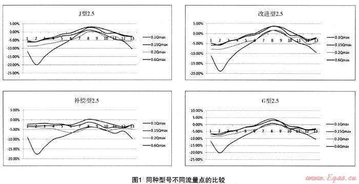 (4) 補(bǔ)償型2.5均有跑慢趨勢,實驗過程中損壞2塊,共計使用了6塊。各檢定流量點無論在實驗前后均有超差現(xiàn)象,若使用這類表,初次檢定就不合格。在實驗過程中共計發(fā)現(xiàn)3次在緊鄰2天中,突然出現(xiàn)超出正常的峰谷值,之后歸于正常的現(xiàn)象,峰谷值的平均值與前后數(shù)據(jù)相比是合理的。主要在大流量條件下發(fā)生。