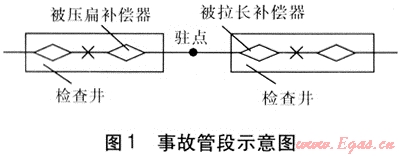 在直埋管道管系中,為減少固定支座的數(shù)量,往往布置成“駐點(diǎn)”形式。直埋管道兩個(gè)規(guī)格型號(hào)相同的相鄰補(bǔ)償器之間管道中點(diǎn)不設(shè)固定點(diǎn),當(dāng)管道受熱均勻膨脹時(shí),在兩個(gè)補(bǔ)償器中間必然形成一個(gè)力的相對(duì)平衡點(diǎn),即駐點(diǎn)。理論上以該點(diǎn)為界,管道向左右兩個(gè)方向均勻膨脹,一般認(rèn)為,力的平衡點(diǎn)會(huì)因管道受力不均勻而發(fā)生少許偏移,一般按20%余量進(jìn)行考慮。筆者認(rèn)為,這種布置方式值得商榷。武威市城南集中供熱有限責(zé)任公司有一段直埋管道(Ø630×10)采用這種布置方式,固定支座之間距離為206m,兩只補(bǔ)償器規(guī)格型號(hào)完全相同,補(bǔ)償量均為150mm。在2008年熱網(wǎng)運(yùn)行中,其同側(cè)兩個(gè)補(bǔ)償器相繼發(fā)生故障,拆解后發(fā)現(xiàn),一個(gè)補(bǔ)償器已被壓扁,壓縮量200mm,另一個(gè)不僅未起到補(bǔ)償壓縮作用,反而被拉長50mm,一個(gè)補(bǔ)償器伸長對(duì)另一個(gè)補(bǔ)償器造成過度壓縮,從而使兩個(gè)補(bǔ)償器均發(fā)生破壞失效,事故管段示意圖見圖1。