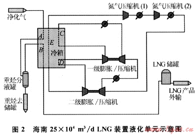 海南LNG工廠天然氣液化裝置是海南省重點(diǎn)建設(shè)項(xiàng)目,生產(chǎn)規(guī)模為25×104m3/d。該天然氣液化裝置的工藝流程由凈化過程和液化過程兩部分組成。