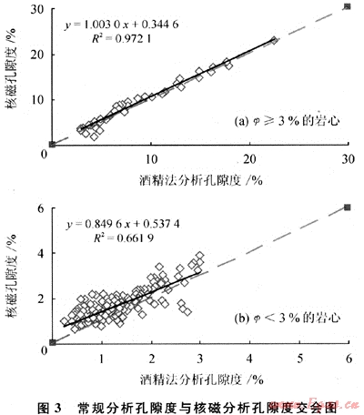 4口井的277塊巖樣的核磁實(shí)驗(yàn)表明:對(duì)于較高孔隙度的樣品核磁可準(zhǔn)確地計(jì)算孔隙度、滲透率,而孔隙度較低的樣品,核磁計(jì)算的孔、滲參數(shù)誤差很大(圖3)。