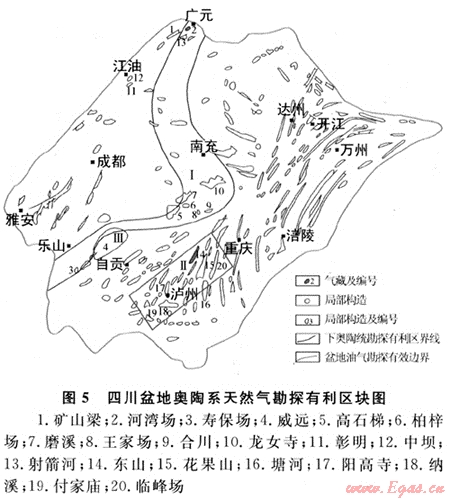 該區(qū)塊位于盆地中、西部,由廣元經(jīng)南充-樂山,向東呈鼻狀突出,面積約2.4×104km2(圖5)。從古地質(zhì)圖上可明顯看出,該區(qū)經(jīng)加里東期后的強烈剝蝕,下奧陶統(tǒng)已全面暴露地表,下奧陶統(tǒng)沉積時為碳酸鹽相向上變?yōu)樗樾紟r相,其底部常為碳酸鹽巖,經(jīng)鉆探證實女基井南津關(guān)組尚殘存有厚39m最容易溶蝕的生物灰?guī)r及鮞?;?guī)r,磨深1井和高科1井殘厚也分別達54.5m及22m,它們在長期遭受淡水溶蝕的情況下,必然會形成眾多古巖溶縫、洞。當其被上覆的中二疊統(tǒng)棲霞組泥頁巖及致密灰?guī)r封蓋后,皆可成為良好的儲層。除已知局部構(gòu)造外,若區(qū)內(nèi)在古地形上,奧陶系儲層有殘丘或隆起,均可能是氣聚集的良好場所。甚至,由于古巖溶縫、洞的形成,并不受構(gòu)造和地域的限制,即使向斜內(nèi)如瀘州地區(qū)云錦向斜的云錦7井和云錦8井,在鉆入中二疊統(tǒng)茅口組儲層均有鉆具放空顯示,并獲得工業(yè)氣流,這就進一步提示我們在勘探奧陶系儲層時,不僅要注重背斜圈閉,在一定條件下還要從非背斜油氣藏的角度去考慮,這將更會有益于勘探。本區(qū)塊的局部構(gòu)造,有礦山梁、河灣場、龍女寺、磨溪以及高石梯等10余個構(gòu)造,可供勘探。尤其是本區(qū)塊北段,靠近天井山古隆起一帶,如前所述已發(fā)現(xiàn)較多巨型瀝青脈,這在全國來說也是罕見,經(jīng)淺井鉆探,于200m以下還有液態(tài)原油,也許該區(qū)地腹還可能有下寒武統(tǒng)九老洞組油藏存在。因此對該區(qū)奧陶系來說,最現(xiàn)實的是廣元河灣場構(gòu)造河深1井已發(fā)現(xiàn)工業(yè)氣流,與其相鄰的一些構(gòu)造也可能有奧陶系氣藏存在,值得重視。