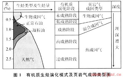 與常規(guī)油氣藏的成藏條件不同,頁(yè)巖氣來(lái)源由生物成因氣和熱成因氣組成,吸附氣和游離氣并存,具有自生自儲(chǔ)(或短距離運(yùn)移)的特征。因此頁(yè)巖氣聚集受埋藏深度、有機(jī)質(zhì)的成熟度及輸導(dǎo)、封蓋條件制約較小。埋藏較淺、有機(jī)質(zhì)成熟度低的區(qū)段發(fā)育生物成因的頁(yè)巖氣;埋藏深、有機(jī)質(zhì)成熟度高的區(qū)段發(fā)育熱成因的頁(yè)巖氣;埋藏深度和有機(jī)質(zhì)成熟度中等偏低的區(qū)段發(fā)育混合成因的頁(yè)巖氣(圖1)。美國(guó)第一口頁(yè)巖氣發(fā)現(xiàn)井深度最淺,還不足10m,而Haynesville頁(yè)巖氣聚集最大深度則近4000m;Antrim頁(yè)巖氣的有機(jī)質(zhì)成熟度(Ro)僅為0.4%~0.6%,Lewis頁(yè)巖氣的Ro則為1.6%~1.9%,頁(yè)巖氣聚集的Ro最大可達(dá)3%[24~33]。