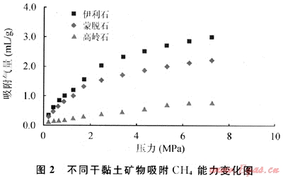 頁(yè)巖的主要黏土礦物為伊利石、蒙脫石、高嶺石和綠泥石。不同的黏土礦物對(duì)天然氣的吸附能力有著明顯的差別。在30℃溫度條件下,干黏土CH4吸附實(shí)驗(yàn)結(jié)果表明:伊利石和蒙脫石吸附CH4能力明顯高于高嶺石(圖2)[36]。