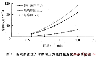 2) 環(huán)空注入。環(huán)空注入壓裂是在地層破裂后通過(guò)油管、套管環(huán)空注入攜砂液進(jìn)行后續(xù)作業(yè),同時(shí)降低(或關(guān)閉)連續(xù)油管排量進(jìn)行井底壓力檢測(cè)。環(huán)形空間的流動(dòng)通道遠(yuǎn)遠(yuǎn)大于連續(xù)油管,同時(shí)由于攜砂液不再流經(jīng)噴嘴而不存在節(jié)流摩阻,從而大大降低了摩阻損失,具體計(jì)算結(jié)果見(jiàn)圖3。即使排量為8m3/min,3000m管柱環(huán)空摩阻也僅為16MPa左右,排量較低時(shí)基本可以忽略摩阻影響,這為大排量施工奠定了基礎(chǔ)。