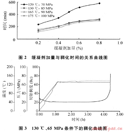 實(shí)驗(yàn)結(jié)果表明,隨著緩凝劑加量的增加,水泥漿稠化時(shí)間增大,稠化時(shí)間與摻量具有良好的線(xiàn)性關(guān)系。加入該高溫緩凝劑的水泥漿,初始稠度低,且在長(zhǎng)時(shí)間內(nèi)穩(wěn)定,具有很好的直角稠化特性,抗竄能力強(qiáng)。