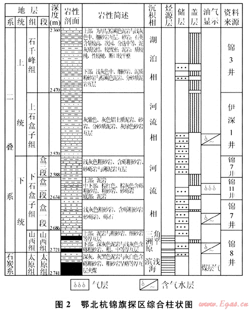 石炭系太原組和二疊系山西組發(fā)育的煤層、暗色泥巖及碳質(zhì)泥巖可以作為本區(qū)良好的烴源巖,這2組地層中發(fā)育的砂體與石盒子組砂體、泥巖一起構(gòu)成了本區(qū)油氣儲集層和封蓋層(圖2)。