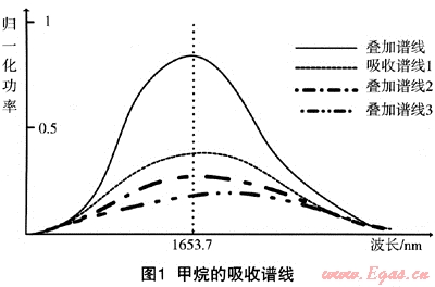 便攜式甲烷激光遙感探測儀是基于近紅外二極管激光吸收光譜的新型高靈敏度測量儀器,選擇甲烷分子的強(qiáng)吸收譜線,不受其它氣體成分的干擾,甲烷在波數(shù)6046.96cm-1位置(波數(shù)等于1cm除以波長,即對應(yīng)波長1653.7nm)有3條吸收譜線,這3條譜線疊加在一起,形成了一個強(qiáng)吸收線,如圖1所示。
