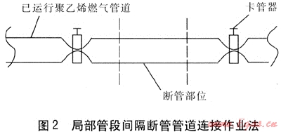 局部管段間隔斷管管道連接作業(yè)法見(jiàn)圖2。本作業(yè)適用于已運(yùn)行聚乙烯燃?xì)夤艿琅c新建燃?xì)釶E管道的連接。在聚乙烯管道需連接部位左右適當(dāng)位置分別采用卡管器將已運(yùn)行管道卡緊,選用隔爆手槍電鉆在需斷管部位打孔卸壓、斷管。將電熔套管安裝在斷管兩端口并與新建聚乙烯管進(jìn)行電熔焊接,待焊接完成后松開(kāi)卡管器,管道連接作業(yè)完成。此作業(yè)方法優(yōu)點(diǎn)主要是操作方便,但存在的問(wèn)題主要有: