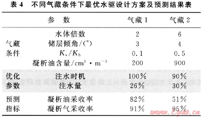通過上述對(duì)凝析氣藏不同的注水方案結(jié)果進(jìn)行的統(tǒng)計(jì)分析,明確了不同參數(shù)和因素對(duì)于凝析氣藏注水開發(fā)效果的影響。之后可以得出不同條件下的凝析氣藏注水開發(fā)的最優(yōu)方案,并對(duì)其凝析油氣的采收率進(jìn)行預(yù)測(cè)。筆者以兩種不同條件下的凝析氣藏為例,給出了最優(yōu)注水開發(fā)方案的設(shè)計(jì)參數(shù)及預(yù)測(cè)指標(biāo)(表4)。