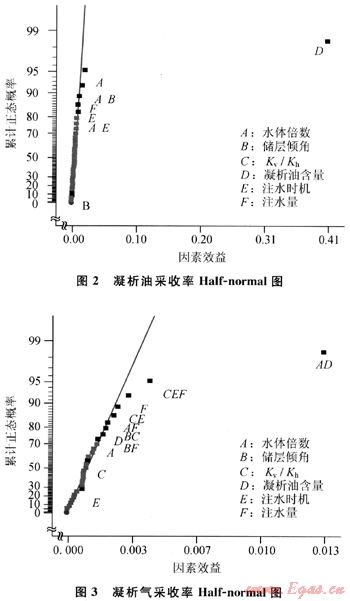 Half-normal圖的橫坐標(biāo)代表各因素在兩水平之間變化時(shí)引起的相應(yīng)凝析油氣指標(biāo)平均值的變化,縱坐標(biāo)代表累計(jì)概率。如果某因素從低到高變化時(shí)引起評(píng)價(jià)指標(biāo)的減少,那么其影響是負(fù)面的;反之如果引起評(píng)價(jià)指標(biāo)增大則說明其作用是正面的。該圖主要由代表不同因素和不同因素交互作用的點(diǎn)與一條通過大多數(shù)點(diǎn)的直線構(gòu)成。由代表不同因素的點(diǎn)偏離直線的程度可以看出其所對(duì)應(yīng)的指標(biāo)影響的重要性程度,由左到右偏離的越多影響越重要。