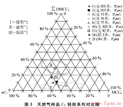 此外,利用C7輕烴系列化合物和烷烴碳同位素值[13~15]也可有效判別天然氣成因類型。如圖3所示,天然氣樣品明顯呈3個(gè)點(diǎn)群分布:Ⅰ類甲基環(huán)己烷(MCC6)含量相對(duì)較高,二甲基環(huán)戊烷(DMCC5)含量低(小于10%),為典型的煤型氣;Ⅱ類二甲基環(huán)戊烷的相對(duì)含量則有明顯增高(大于20%),屬油型氣;Ⅲ類C7輕烴系列的相對(duì)含量介于Ⅰ類和Ⅱ類之間,為油型氣和煤型氣的混源氣。
