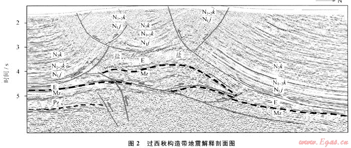庫車地區(qū)的勘探實(shí)踐表明,膏鹽層塑性增厚部位往往發(fā)育在地表背斜的核部,鹽下背斜通常位于地表背斜的翼部或者地表向斜以下,無論克拉蘇構(gòu)造帶還是東秋迪那構(gòu)造帶都具備這樣一個(gè)特征。大宛齊鹽拱實(shí)際上是喀桑托開背斜向西的延伸部分,并非特殊,這和秋參1井以南的鹽拱是一個(gè)模式。西秋構(gòu)造帶的構(gòu)造樣式和克拉蘇及東秋迪那構(gòu)造帶非常接近,過東秋6井和迪那3井的地震剖面鹽下構(gòu)造形態(tài)與西秋構(gòu)造帶有較強(qiáng)的類似性,北翼也有反沖斷層。而北翼的反沖斷層正是造成西秋構(gòu)造帶復(fù)雜性的原因之一,也正由于北翼斷裂導(dǎo)致地層重復(fù)才使核部鹽下構(gòu)造北翼的隆升,促成地表形成復(fù)背斜,這和克拉蘇構(gòu)造帶極其相似。從克拉蘇及迪那構(gòu)造帶的構(gòu)造形態(tài)不難想到西秋的鹽下地層已經(jīng)大幅度卷入隆升,強(qiáng)波組反射正是鹽下古近系砂泥巖和中生界的反映。這表明南、北秋里塔格之間的中部戈壁區(qū)以下發(fā)育有大型鹽下構(gòu)造圈閉,有望成為新的勘探靶區(qū)。