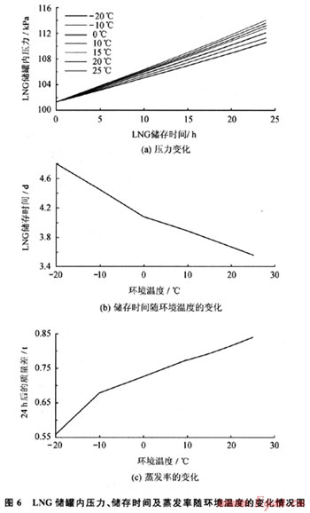 LNG儲罐內(nèi)壓力、儲存時間及蒸發(fā)率隨環(huán)境溫度的變化情況如圖6所示。