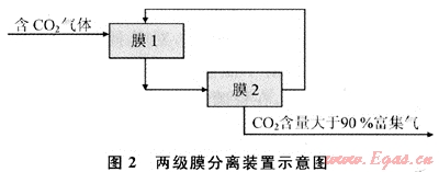 膜分離法是利用某些聚合材料制成的薄膜對不同氣體具有不同滲透率來選擇分離氣體的。膜分離的驅(qū)動力是膜兩側(cè)的壓差,在壓差條件下,滲透率高的氣體組分優(yōu)先透過薄膜,形成滲透氣流,滲透率低的氣體則在薄膜進氣側(cè)形成殘留氣流,兩股氣流分別引出從而達到分離的目的[21]。適用于CO2分離的膜材料為乙酸纖維、聚砜、聚酰胺等,由于膜本身或膜組件的其他材料耐熱性能差,150℃是其操作溫度的上限。近年來一些性能優(yōu)異的新型膜材質(zhì)正不斷涌現(xiàn),如聚酰亞胺膜、聚苯氧改性膜、二胺基聚砜復(fù)合膜、含二胺的聚碳酸酯復(fù)合膜、丙烯酸酯的低分子含浸膜等均表現(xiàn)出優(yōu)異的C02滲透性。最近也有一些硅石、沸石和碳素?zé)o機膜的研制,但均存在使用溫度高、成本高,長期運行可靠性差等問題。圖2為兩級膜分離富集CO2流程圖。