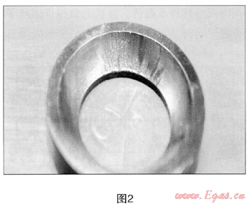 (1) 在壓縮氣體行業(yè),采用液壓加氣子站車裝卸運(yùn)輸高壓天然氣時(shí),閥門在開啟時(shí)壓力非常高,并通常含有一定量的雜質(zhì),氣體或液壓油在流動(dòng)的過程中,在高壓的作用下,當(dāng)高壓循環(huán)油或天然氣通過閥門時(shí),由于柱塞泵瞬間壓力過大,氣體溫度會(huì)快速升高,使聚甲醛閥體的。型密封圈變軟,這使氣體的雜質(zhì)在高壓的沖擊下,很容易在通過閥體時(shí)放射性劃傷密封面(見圖2),造成氣體泄漏。
