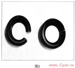 (2) 當(dāng)充泄氣體球閥開啟,在瞬間的小開度時(shí)介質(zhì)的流通間隙小,會(huì)使壓力瞬間增大,氣體或循環(huán)油首先直接沖擊在0型密封圈邊緣部位,由于0型密封圈的耐壓程度是有限的(一般不超過800Pa),就會(huì)瞬間將密封圈邊緣造成嚴(yán)重沖刷,從而影響閥門的密封性能和使用壽命。圖3為被沖擊破壞的0型密封圈。