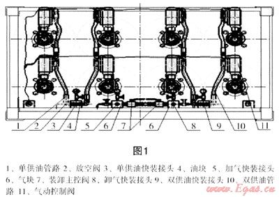 天然氣液壓子站加氣半掛車是將由8只大直徑氣瓶的管束橇安裝在1個(gè)可以舉升15°角的專用底盤上。前后倉(cāng)內(nèi)各氣瓶端口均設(shè)有氣動(dòng)控制閥、安全放散裝置及充卸氣管路等,如圖1。