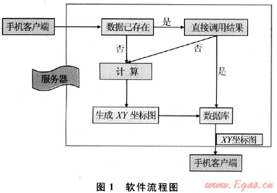 由于該軟件采用循環(huán)迭代試算法求解,涉及的數(shù)據(jù)計(jì)算量較大。因此,主要計(jì)算功能無法用手機(jī)完成,需要與服務(wù)器進(jìn)行數(shù)據(jù)通訊,采用的方式如圖1所示。由手機(jī)客戶端提交計(jì)算參數(shù),利用主控服務(wù)器進(jìn)行計(jì)算,計(jì)算后利用計(jì)算結(jié)果產(chǎn)生直觀的XY坐標(biāo)圖,再將圖片傳輸回手機(jī)并顯示。