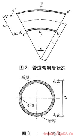 天然氣高壓管道進(jìn)行彎制時,管道彎曲段受力變形,彎制前狀態(tài)見圖1,彎制后狀態(tài)見圖2,彎曲段Ⅰ′-Ⅰ′斷面見圖3。管道在彎制過程中,內(nèi)側(cè)管壁受壓力,由于擠壓作用管壁由直線形(如CD段)變成圓弧形(如C′D′段),管壁由于壓縮變短而增厚;外側(cè)管壁受拉力,由于拉伸作用管壁由直線形(如AB段)變成圓弧形(如A′B′段),管壁由于拉伸變長而減薄。管壁減薄會使強(qiáng)度降低,為保證管壁減薄后仍有足夠強(qiáng)度,要求管壁有一定厚度,在彎曲段管壁減薄應(yīng)均勻。