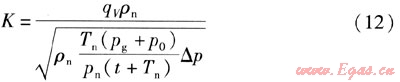 將數(shù)據(jù)qV=3000m3/h,ρn=1.293kg/m3,L=273.15K,pg=5kPa,p0=100kPa,pn=101.32kPa,t=20℃,△p=0.74377kPa代入式(12),可求得:K=4025.3021。