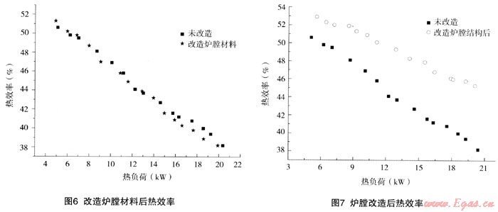 (2) 爐膛材料雖對熱效率影響不大,但將普通粘土磚改為硅酸鋁板,可加快爐膛溫升,降低鍋圈溫度和爐膛無效蓄熱,改善操作環(huán)境。