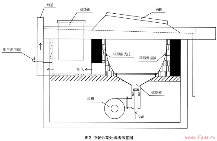 圖2為中餐灶結(jié)構示意岡,爐膛結(jié)構主要影響煙氣對流換熱,煙氣主要分為兩部分:一是經(jīng)鍋圈排煙氣,其對熱效率影響較大;二是經(jīng)煙道排炯氣,其一般加熱溫鍋灶后再排出,排煙溫度約在200℃以上。經(jīng)過鍋圈流出煙氣主要是以對流方式加熱鍋底和鍋側(cè),提高速度有利于提高對流換熱,則鍋與爐膛耐火保溫材料間隙、鍋圈與鍋之間間隙成為重要因素。另外,兩股氣流的分配也影響到中餐灶的熱效率。