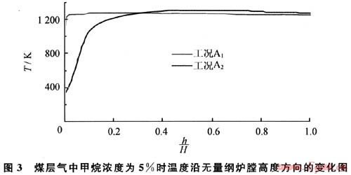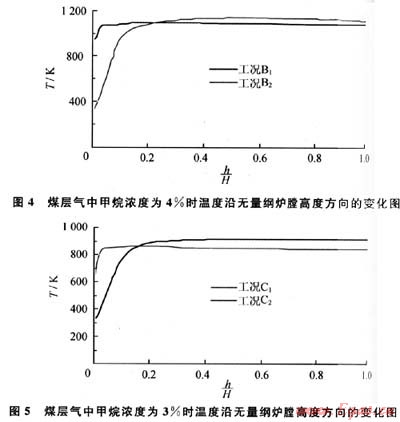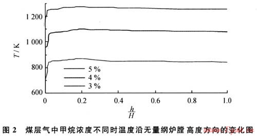 在3種工況條件下,h/H大于0.05時(shí)爐膛溫度均大于840K,而甲烷的著火溫度為811K。當(dāng)爐膛的溫度大于甲烷的著火溫度時(shí)就可以維持燃燒,這說明在煤層氣中甲烷濃度不低于3%時(shí),利用流態(tài)化蓄熱裝置可以維持燃燒。對計(jì)算區(qū)域溫度取平均值并定義為爐膛的平均溫度,當(dāng)煤層氣中甲烷濃度為5%、4%、3%時(shí),爐膛的平均溫度分別為1256K、1080K、842K。煤層氣中甲烷濃度由5%下降到4%時(shí),爐膛平均溫度下降,溫度下降值△T1為176K;煤層氣中甲烷濃度由4%下降到3%時(shí)溫度下降值△T2為238K。可見,隨著煤層氣中甲烷濃度的下降,溫度降低,并且下降幅度有增大趨勢,可以判斷,當(dāng)煤層氣中甲烷濃度低于3%時(shí),爐膛溫度迅速降低并低于甲烷的著火溫度811K,無法維持煤層氣在爐膛中的燃燒,這和數(shù)值模擬中當(dāng)煤層氣中甲烷濃度低于3%時(shí)不能燃燒的計(jì)算結(jié)果是一致的。所以流化床蓄熱裝置燃燒超低濃度煤層氣的著火極限濃度為3%。