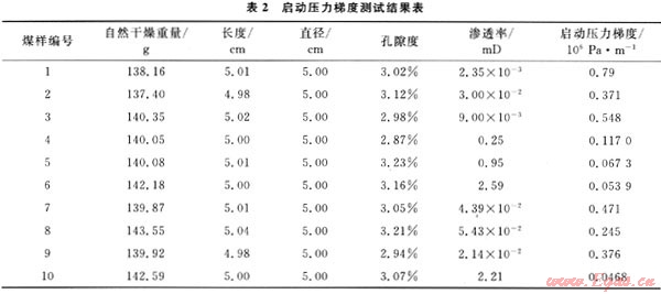 依上述的測試手段和啟動壓力梯度計算方法,對同一煤樣鉆取的其余10個煤心進行測試和計算,樣品信息和結(jié)果見表2。