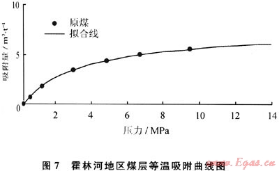 煤的等溫吸附實驗顯示,霍林河地區(qū)煤層的吸附性能較差,蘭氏體積及壓力較小,蘭氏體積為1.7~7.74m3,蘭氏壓力為0.9~3.68MPa(圖7)。測定甲烷δ13C1值為-62%,顯示有生物氣的特點,說明該區(qū)煤層氣主要為生物成因氣。因此,雖然該區(qū)煤層熱解氣量小,煤層吸附能力較低,但生物氣的補充與良好的保存條件保證了該區(qū)仍有較高的含氣量與含氣飽和度,對煤層氣成藏有利。