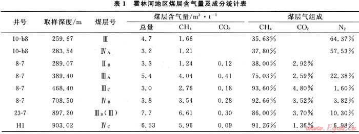 本區(qū)煤層含氣量的資料不多,從部分煤炭鉆孔中取樣測試得到的含氣量最高達到了7.7m3/t(如表1)。煤層氣井H1井煤樣測試含氣量為2.08~6.53m3/t,煤層甲烷平均含量為91.47%,總體隨埋藏深度的增加,煤層含氣量與甲烷含量均增加。