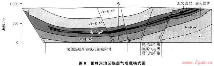 霍林河地區(qū)地下水環(huán)境較好,地下水為HCO3-Ca型和HCO3-Na-Ca型,礦化度低,淺層單斜緩坡容易形成生物氣補給;淺層孔滲性好,深部煤層氣向上運移,淺部如蓋層條件好則在高部位富集成藏形成游離氣與吸附氣復式氣藏(圖8)。