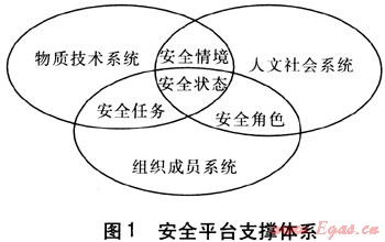 物質(zhì)技術(shù)系統(tǒng)、人文社會(huì)系統(tǒng)和組織成員系統(tǒng)3個(gè)集合的交叉構(gòu)成了3種聯(lián)系,形成安全情境、安全任務(wù)、安全角色和安全狀態(tài)4個(gè)交集。其中物質(zhì)技術(shù)系統(tǒng)與人文社會(huì)系統(tǒng)的交集構(gòu)成了管道燃?xì)馄髽I(yè)所處的軟環(huán)境和硬環(huán)境,稱為安全情境。人文社會(huì)系統(tǒng)與組織成員系統(tǒng)的交集決定了管道燃?xì)馄髽I(yè)中員工在安全生產(chǎn)中的身份,稱為安全角色。物質(zhì)技術(shù)系統(tǒng)與組織成員系統(tǒng)的交集劃定了組織成員在生產(chǎn)中所擔(dān)負(fù)的責(zé)任,稱為安傘任務(wù)。物質(zhì)技術(shù)系統(tǒng)、人文社會(huì)系統(tǒng)和組織成員系統(tǒng)三者的交集成為管道燃?xì)馄髽I(yè)的安全狀態(tài)。安全平臺(tái)支撐體系見圖1。