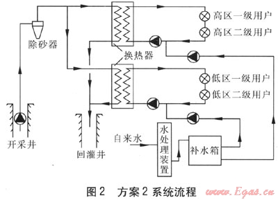 方案2,僅利用地?zé)崴幔顭崴呻姛崴髦苽?。建筑物分為高區(qū)、低區(qū)供暖系統(tǒng),由于地?zé)峋鏊疁囟葹?0℃,因此宜采用地板輻射供暖系統(tǒng)。為充分利用地?zé)豳Y源,熱用戶采用兩級(jí)串聯(lián)形式,以降低回水溫度,即降低地?zé)嵛菜疁囟?。一?jí)用戶供、回水溫度為50、40℃,二級(jí)用戶供、回水溫度為40、30℃,系統(tǒng)流程見(jiàn)圖2。方案2需在井口附近建1座占地面積為160m2的熱力站,地?zé)崴昧繛?41t/h,回灌溫度為33℃,總用電負(fù)荷為101kW,工程造價(jià)約265×104元。