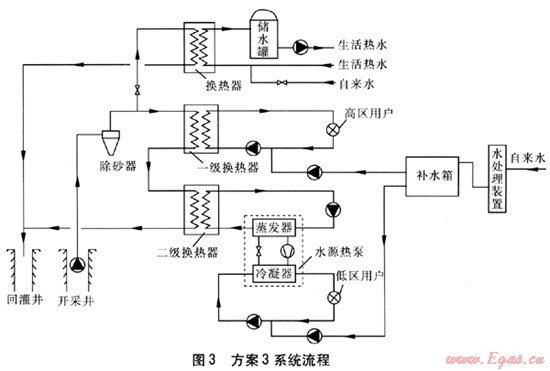 天津市南開(kāi)區(qū)某住宅小區(qū)擬建兩座高層公寓,規(guī)劃建筑面積約11×104m2。在該小區(qū)內(nèi),現(xiàn)有兩眼奧陶系地?zé)峋?。最初,開(kāi)發(fā)商只要求利用地?zé)豳Y源解決小區(qū)生活熱水供應(yīng)。設(shè)計(jì)單位考慮到節(jié)能、環(huán)保,為開(kāi)發(fā)商提供了3種地?zé)豳Y源利用方案,希望地?zé)豳Y源能夠得到充分合理的利用。