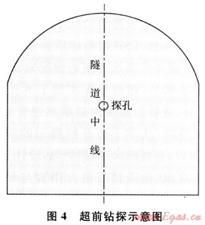 該方法屬于施工過(guò)程中的短距離地質(zhì)預(yù)報(bào)方法,需要采用超前鉆孔進(jìn)行驗(yàn)證。由于西氣東輸二線隧道斷面較小,沿掌子面打超前水平探孔1個(gè)。超前鉆探示意圖如圖4所示。