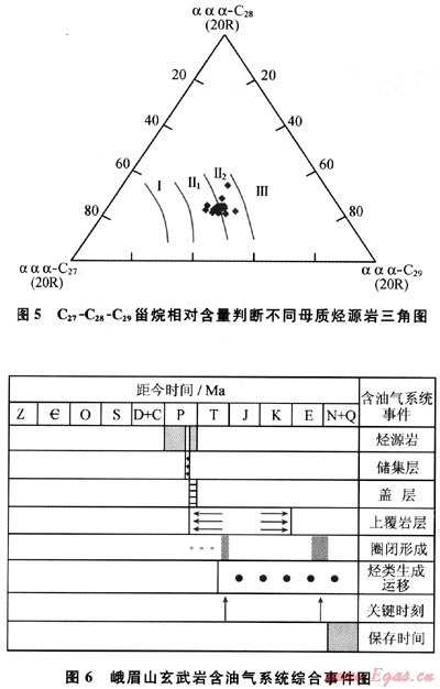 另據(jù)玄武巖瀝青的m/z217質(zhì)量色譜圖(圖4),規(guī)則甾烷呈近“V”字形,C27占優(yōu)勢,反映水生生物輸入有機(jī)質(zhì)較多,利用C27-C28-C29甾烷相對含量判斷烴源巖母質(zhì)類型(圖5),表明除水生生物外,還有部分腐殖型有機(jī)質(zhì)的輸入;由于上覆的沙灣組在漢王場-青神-犍為-珙縣以東地區(qū),已相變?yōu)楹谏搸r夾薄層石灰?guī)r,有時可見薄層碳質(zhì)頁巖和煤層[3],故推測氣源可能有上二疊統(tǒng)煤系地層的貢獻(xiàn)。