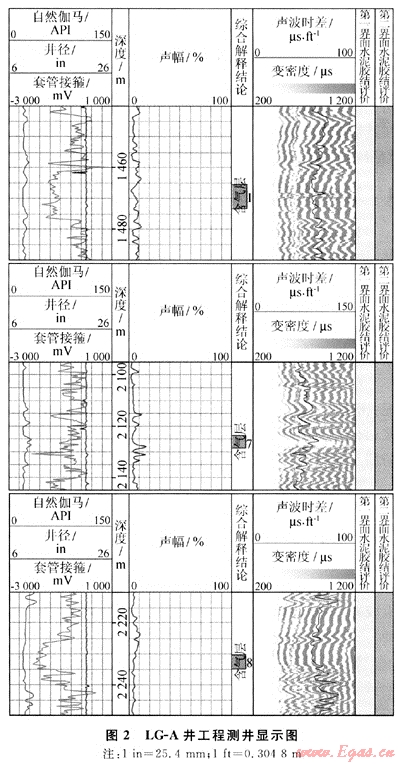 表1是LG-A井固井質量的統(tǒng)計表。統(tǒng)計井段為0~2363.0m。