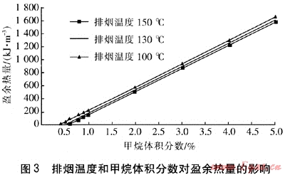 圖3給出了排煙溫度和甲烷體積分?jǐn)?shù)對盈余熱量的影響。從圖3可以看出,在相同甲烷體積分?jǐn)?shù)下排煙溫度越低,盈余熱量越多,主要是因為在甲烷體積分?jǐn)?shù)一定時,排煙溫度越低,煙氣中有更多的熱量被回收利用。在排煙溫度一定時,甲烷體積分?jǐn)?shù)和盈余熱量呈線性關(guān)系。